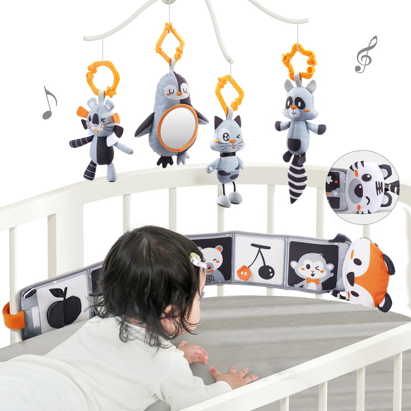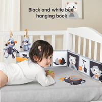 Set of 2 bed bumpers + 4 hanging rattles in Black, white, grey and orange color. Built In rattle, Sounds and sensory. Foldable, easy to carry. Washable, non fading printed fabrics. Can be used in the crib, play gym, strollers or just as is in the hand. The colors specifically aid visual development.